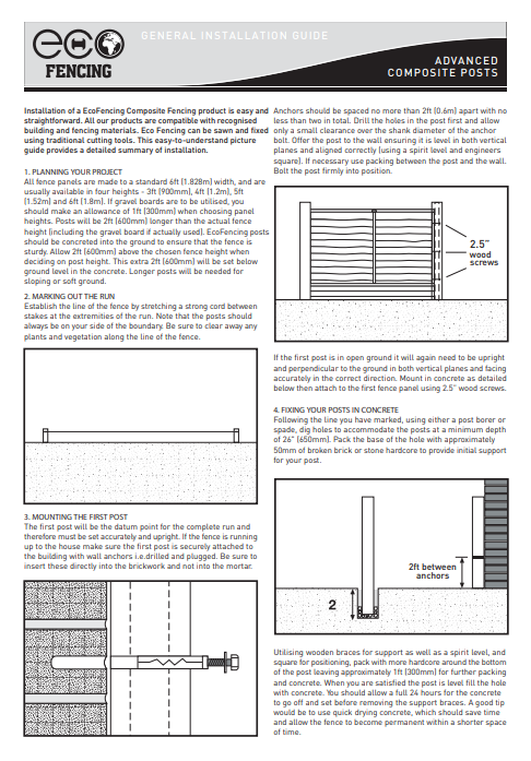 ResourcesDownload our handy installation guide or the product brochure.Still got a question? Get in touch today Downloads pdf • 2MBEco Fencing Brochure Download pdf • 1MBInstallation Guide Download USPs/Why Choose Us 20 year manufacturer guaranteeA long lasting product thats sustainable for years to come. Manufactured in the UKA UK manufactured product that is high quality and long lasting. Maintenance free fencing solutionNo painting, staining, or treating required. Just an occasional clean keeps it looking great year after year. Est 2002We know our stuff when it comes to composite fencing, years of experience and knowledge.Ready to talk about your next project? Contact us request a quote